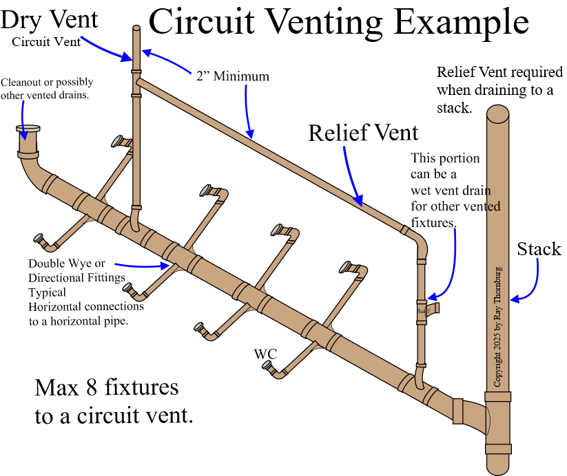 The circuit vent is a kind of horizontal wet vent that is vented by a dry vent which allows more fixture to be connected. It also may have a loop back (relief vent) that connects back to the dry vent which is used when more fixtures are added. In fact a circuit vent resembles a horizontal wet vent except it is required to have a dry vent extending up from the main horizontal drain between the two most upstream fixtures. It can be a very flexible way to meet the venting requirements.