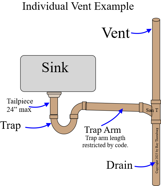The individual vent serves only one fixture. It’s the simplest and most reliable venting method but it’s also the most expensive as it uses the most material. However the individual vent sets the pattern for all the others.