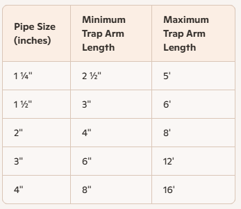 - The trap arm can only pitch downward a distance of one pipe diameter at a maximum slope of 1/4″ per foot.
