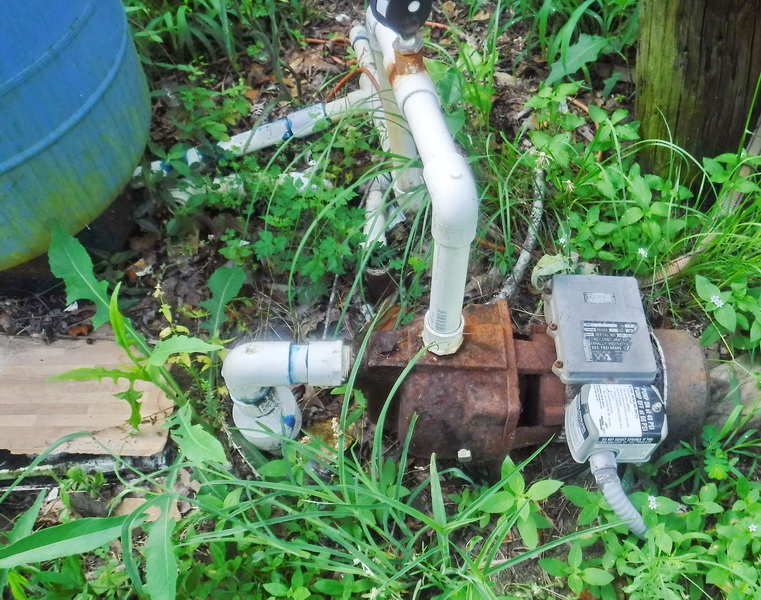 I sometimes encounter a shallow well type I call a sandy point. The Sandy Point Well is a driven well. It has a well point with a screen around it and is literally driven (pounded in) or washed in with a powerful stream of water. The picture above shows one such well tip which was discarded under this home when municipal water was hooked up. These types of wells are shallow wells (less than 25 feet) and are often installed by amateurs. Sometimes they’re used for irrigation or for watering livestock. These types of wells often draw up sediment and are more susceptible to surface water contamination than a bored well. Often the volume of water it produces is less than standard (for a home). In my tests sometimes these fail during testing or fail to bring up a satisfactorily volume of water. When I encounter these types of wells they rarely if ever have a data plate which is required when a certified well driller installed the well. In SC you must be a certified well driller to install a well. So the absence of a data plate is a concern. The picture below shows one such well likely installed by an amateur, with the pump literally sitting on the ground. Not even a concrete block to hold it up! The tank is the same way (not supported properly). Note the absence of insulation and broken pipes laying around indicating past repairs.